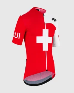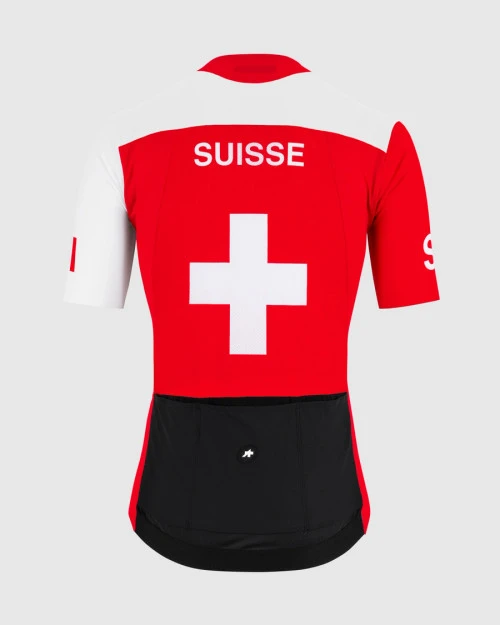 The jersey the Swiss national team wears for competition. Built on our aerodynamic, compressive EQUIPE RS TARGA platform. Differing only in the addition of reflective strips from the jersey design the Swiss national team race in, this updated, second-skin aerodynamic jersey has increased stability thanks to the Stabilizator V7 insert, which anchors the pockets in place on the lower back. The jersey provides UPF 25, 30, and 50+ for the front, back, and sleeves.