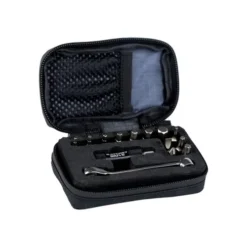 Durable and compact chrome plated ratchet tool designed for bicycles. Fine tooth ratchet with reversing lever and a fixed opening on opposite end. Tool selection optimized for road, gravel and mountain bikes. Super hard CRV (chrome vanadium) bits. Custom, machined aluminium extension adapter with laser etched logo. Integrated magnet holds tool bits in place. Ratchet Kit comes in a compact, soft shell carrying case.