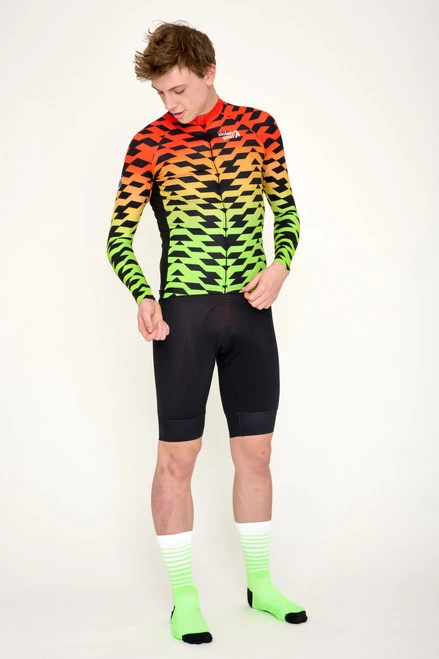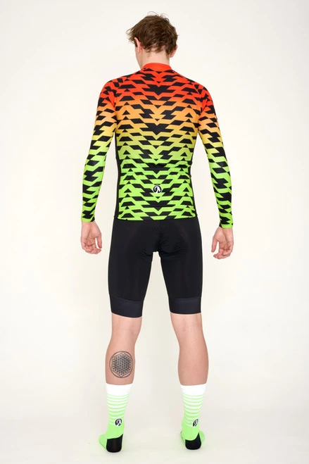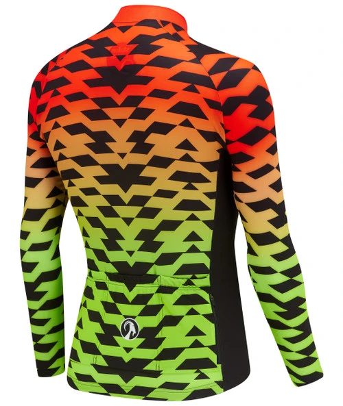 Fire up your bike legs and get ready to ride in style with the men’s Ya-Ya Fire long-sleeved bodyline jersey. Featuring a geometric design with a red to green gradient fade, this fiery number will have you burning through the miles with ease.